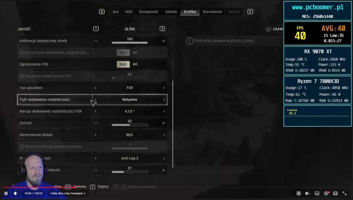 Prawdziwe schody zaczęły się po włączeniu presetu Ultra, który wymusza ray tracing. Średnia spadła do 40 FPS, a 1% low wahał się między 38 a 39, czyli praktycznie przez cały czas byliśmy poniżej granicy płynności. Na szczęście wystarczyło sięgnąć po FSR w trybie Jakość, żeby przekroczyć 60 FPS i komfortowo grać w najwyższych ustawieniach graficznych.