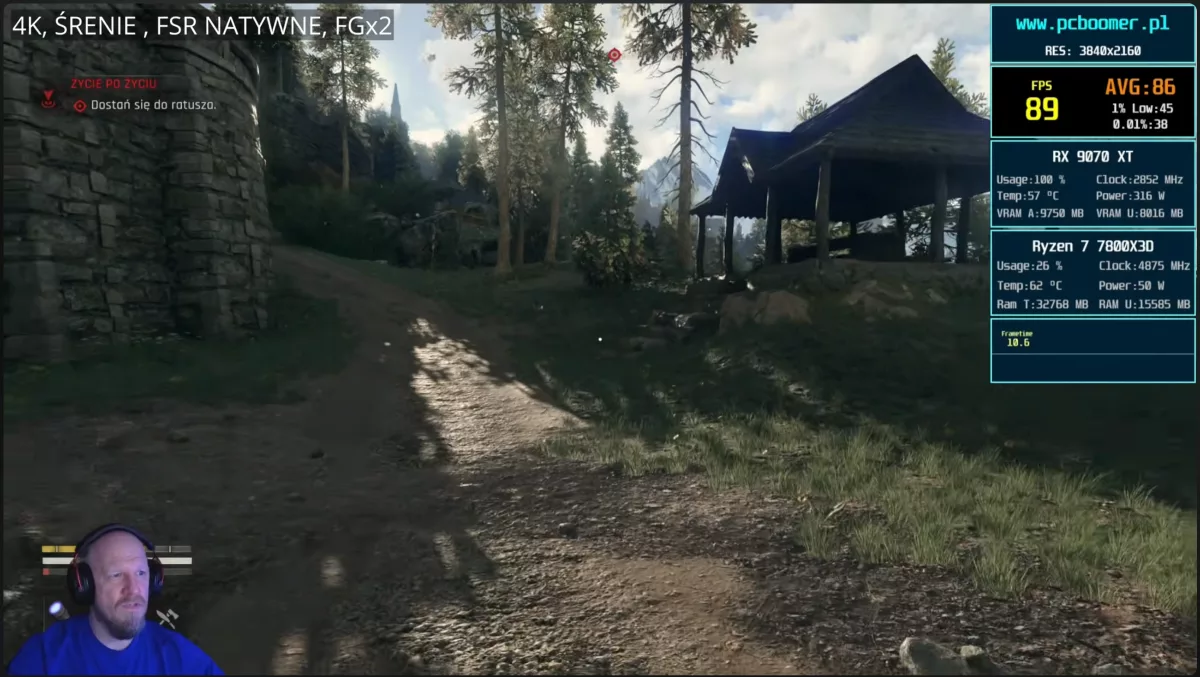 Po przejściu na preset Wysokie z tym samym FSR wynik wyniósł około 76 FPS, a 1% low zatrzymał się na 63, czyli powyżej granicy 60 klatek. Karta niezmiennie pobierała około 316 W, temperatura rdzenia nie przekraczała 57°C, a wentylatory ani razu nie dały o sobie znać nadmiernym hałasem. Żeby się upewnić, w pewnym momencie zdjąłem słuchawki i faktycznie, cisza.
