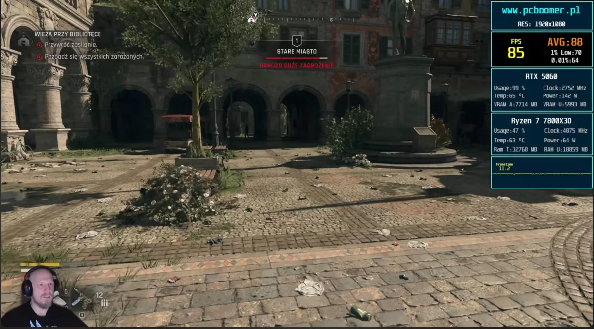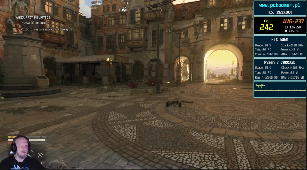 Kończąc testy modelu Asus Dual RTX 5060, wyciągnąłem jeden konkretny wniosek. Jeśli miałbym polecić komuś idealne parametry do ogrywania Dying Light The Beast na tym sprzęcie, zdecydowanie postawiłbym na rozdzielczość 1080p, ustawienia średnie, DLSS w trybie natywnym oraz generator klatek razy dwa. Taka konfiguracja daje solidne 130 klatek, gwarantuje pewną bazę chroniącą przed opóźnieniami i co najważniejsze, zręcznie omija problem niewystarczającej pojemności pamięci VRAM.