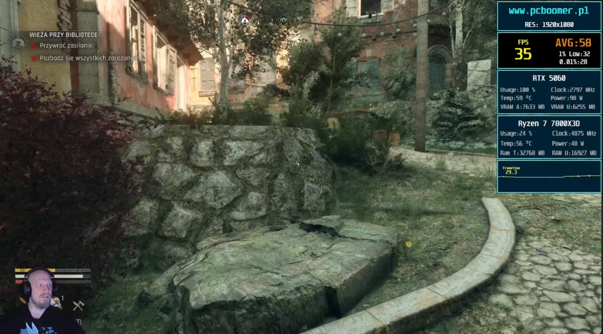Prawdziwe schody i brutalne ograniczenia karty ujawniły się, gdy przełączyłem grafikę na poziom Ultra. Te ustawienia wymuszają włączenie technologii Ray Tracing. Wydajność natychmiast spadła do 37 klatek na sekundę. Uważam, że włączanie śledzenia promieni w tym tytule na karcie pokroju RTX 5060 kompletnie mija się z celem. Koszt w wydajności jest nieproporcjonalny do zysku wizualnego, szczególnie w świetle dnia.